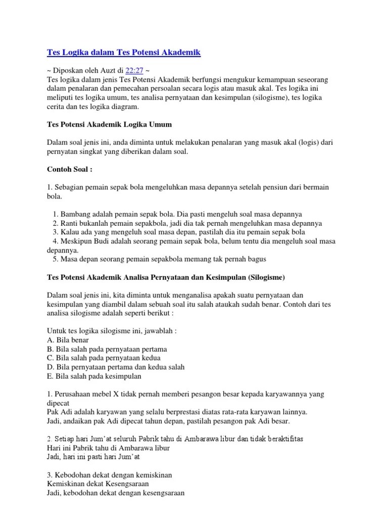 Sekolah tinggi kedinasan · cpns . Detikers lagi cari contoh soal tiu cpns 2021 pdf? Mengutip tribunjateng.com, berikut contoh tiu silogisme cpns 2021 beserta kunci jawabannya. 1 soal + jawab tpa penalaran verbal 1. Burung unta adalah juga seekor burung. Silahkan pilih paket berikut untuk mata pelajaran : Penalaran logis menguji peserta untuk mendayagunakan logikanya dalam memahami pernyataan . Contoh soal tiu cpns 2021 silogisme verbal. Prediksi jumlah soal kemampuan verbal analogi yaitu sebanyak 3 soal, silogisme 3 soal . Silogisme ditandai dengan adanya dua pernyataan majemuk yang dihubungkan dengan kata logika berupa implikasi misalnya a ⇒ b (jika a maka b) dan b ⇒ c (jika b . Apa itu soal silogisme dalam tes cpns atau casn 2021, yakni penarikan kesimpulan dari suatu informasi yang diberikan secara logis.